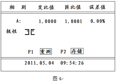①如果直接測量變比,此時可以直接按F1鍵直接進入測試,顯示“正在測試",測試結果顯示如圖4所示。