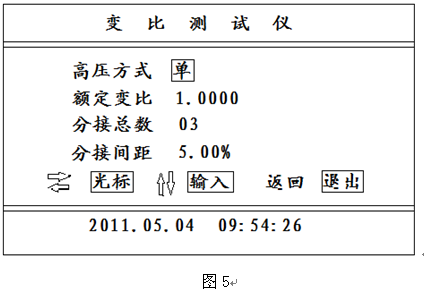 向上向下鍵按下,圖5的狀態可以改變高壓方式,選擇項目包括“Y"、“D"、“單"、“Z",可以循環選擇,選擇“單",測試時可以測量單相變壓器或PT;光標在其他位置時可以改變數字的大??;